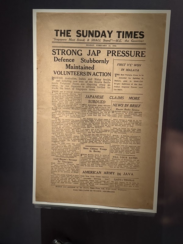 What I found most interesting, though, was the museum's own narrative stance. The Former Ford Factory does not tell the British version of the fall of Singapore. It does not tell the Japanese version. It tells a Singaporean version, which is something else entirely. The British narrative centers on military failure, strategic overextension, and the loss of imperial prestige. The Japanese narrative centers on liberation, the Co-Prosperity Sphere, and the assertion of Asian power against Western colonialism. The Singaporean narrative centers on civilian survival, communal resilience, and the road from colonial subject to independent nation. The surrender and the occupation are not the point of the story; they are the backdrop against which Singapore's own story begins.